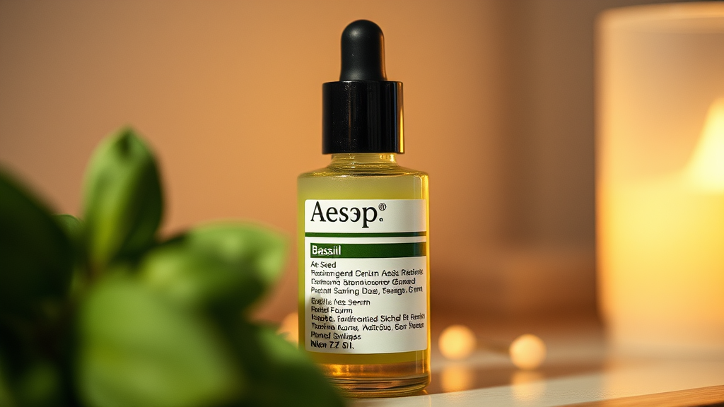Close-up capture, Aesop's Basil Seed Radiance Serum, Nikon Z7 II, highlighting the serum's sophisticated design and natural essence, enveloped in a cozy, gentle light ambiance.