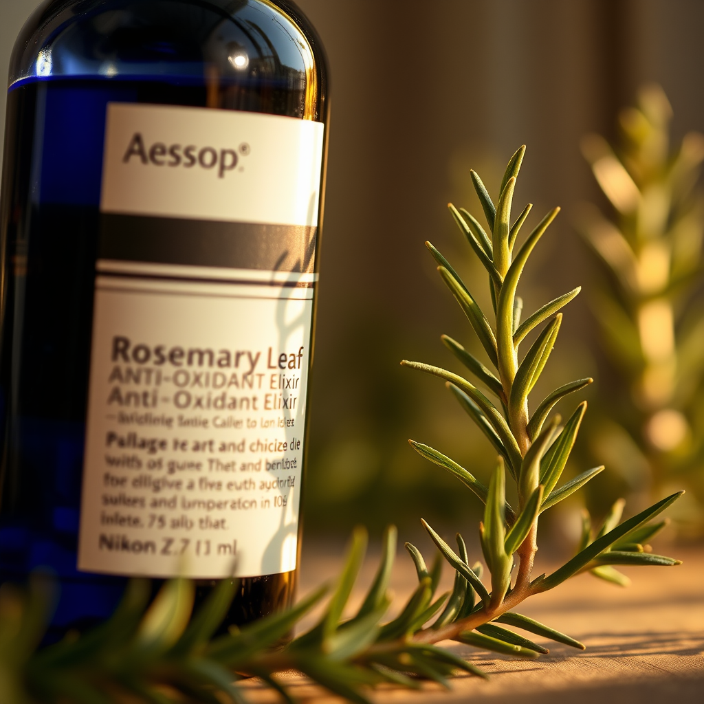 Close-up capturing Aesop's Rosemary Leaf Anti-Oxidant Elixir, shot with a Nikon Z7 II, highlighting the elixir's sophisticated bottle design and natural allure, enveloped in a gentle, golden light setting.