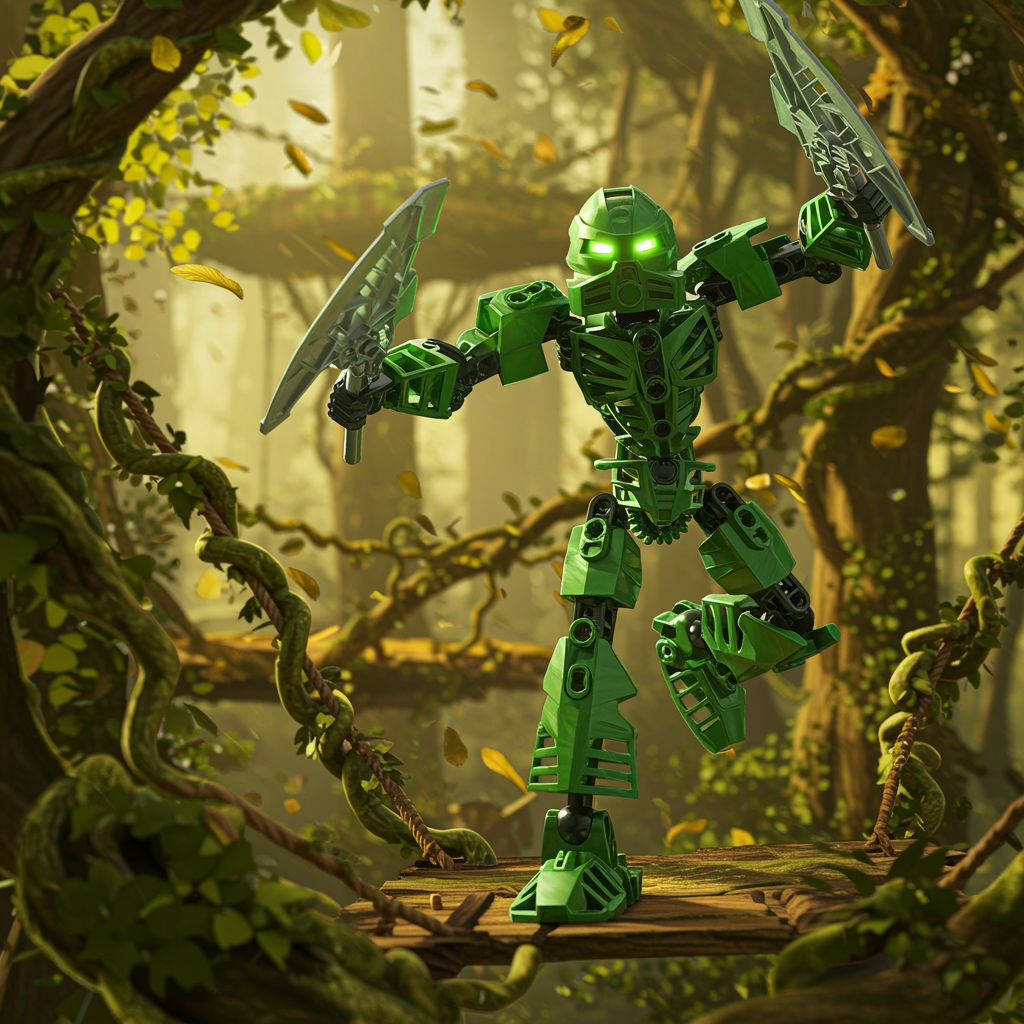 Close-up cinematic CGI rendering of a green Bionicle Toa of Air robot, with glowing emerald eyes and an intricate mask, dynamically leaping across suspended bridges in the treetop village of Le-Koro. Lush vines twist and sway around the bridges, while golden-hued leaves drift gently through the warm, sunlit air, creating an atmosphere of adventure and intrigue in this verdant canopy.