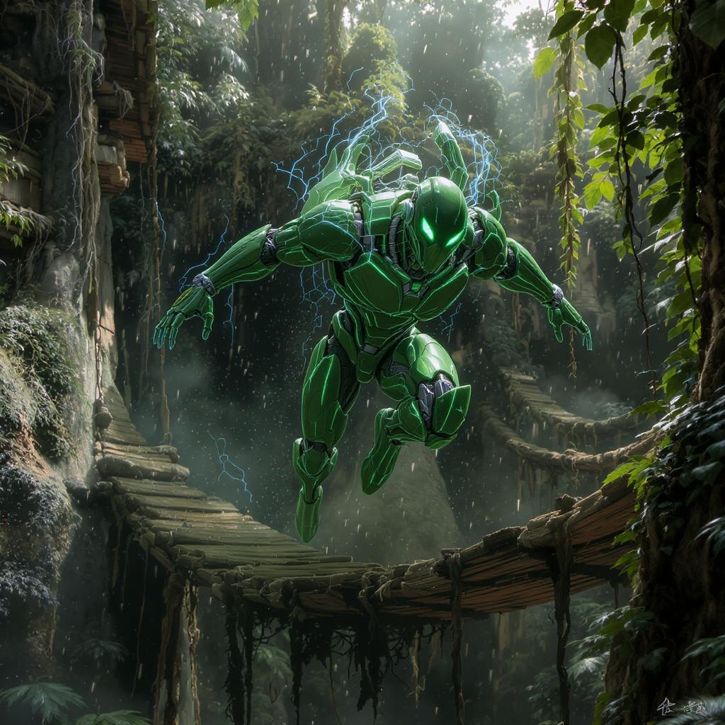Close-up cinematic rendering of a futuristic green robotic warrior with luminescent green eyes and a sleek mask, leaping dynamically across ancient hanging bridges in a lush jungle village. Vines sway and leaves cascade around the scene, capturing a vibrant, action-packed atmosphere reminiscent of an alien habitat, as sunlight filters through the dense canopy above.