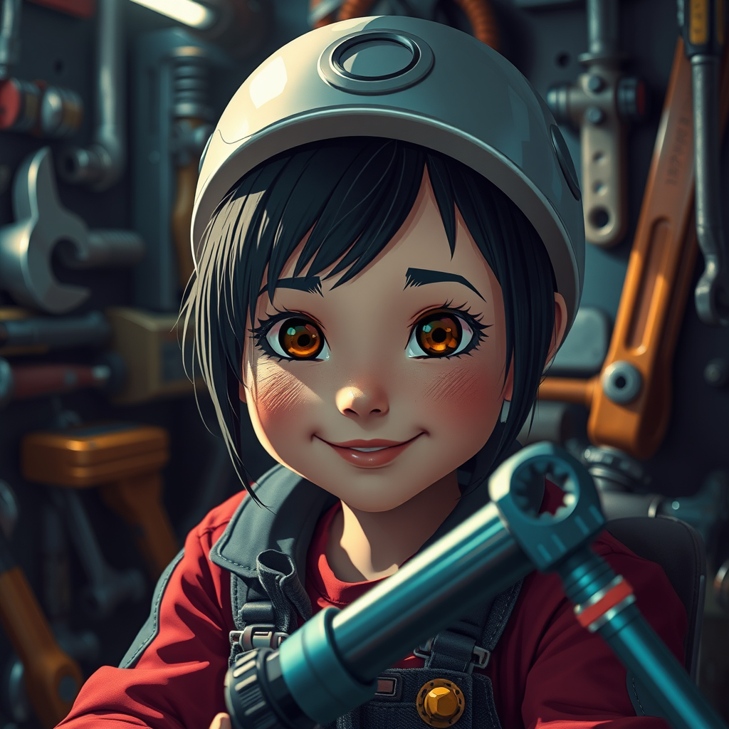 Close-up cinematic shot capturing a young mechanic girl enjoying her afternoon in a detailed, dystopian mechanic interior. Her cute, happy face is full of energy, with prominent, expressive eyes, and a detailed mouth and nose, conveying an innocent aura. She sits amidst an ultra-detailed backdrop of mechanic tools, such as a wrench and screwdriver, showcasing the vibrant, futuristic environment. The composition draws inspiration from "Ghost in the Shell," emphasizing a stunning, visually engaging setting with vibrant colors in a 2D digital illustration style. The artwork, while maintaining its 64k, HDR quality, presents a clean, unified depiction without any photographic errors or distortions. It subtly avoids any negative visual artifacts, ensuring a masterpiece representation of a vibrant mechanical world.