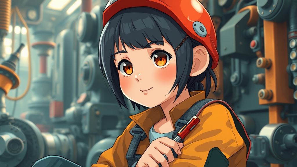 Close up cinematic shot of a young mechanic girl sitting and enjoying an afternoon, her face exudes cuteness and energy. She sits amidst a highly detailed dystopian mechanic background, surrounded by intricate machinery. Her face is carefully detailed, featuring expressive eyes, a petite nose, and a charming mouth. She is equipped with accessories like an ultra-detailed wrench and screwdriver, reflecting her trade. This 2D digital illustration is crafted with vibrant colors, drawing inspiration from the iconic "Ghost in the Shell." Despite the vibrant setting, the image maintains a flat 2D vector style, focusing on a flawlessly detailed character design that captures the essence of a skilled and joyful mechanic in a world where mechanical wonders abound.