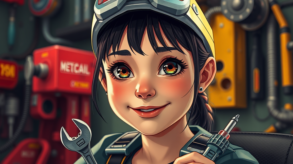 Close up cinematic shot of a young mechanic girl sitting and enjoying her afternoon, featuring a cute and happy face. She exudes energy in a vibrant, ultra-detailed mechanic interior that hints at a dystopian setting. Her expression is innocent with exceptionally detailed eyes, nose, mouth, and lips. The scene showcases a captivating blend of detailed mechanic tools, specifically a wrench and screwdriver, as accessories. Rendered in 2D with a focus on character design and digital illustration, vibrant colors bring the image to life. The environment is stunning, inspired by the essence of works like Ghost in the Shell, and characterized by meticulous attention to detail. The composition transforms a traditionally stark setting into a vibrant masterpiece, while making subtle creative alterations to maintain originality.