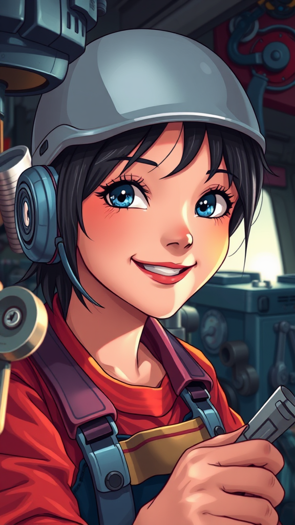 Close-up detailed illustration of a young female mechanic enjoying an afternoon, showing a happy and energetic demeanor. She possesses a cute and innocent face with intricately detailed eyes, nose, mouth, and lips. She's seated within an ultra-detailed, dystopian mechanic interior, surrounded by mechanical tools such as a wrench and screwdriver. The environment is vibrant and colorful, with a touch of inspiration from "Ghost in the Shell." The image is a 2D digital illustration, emphasizing vector art style, and captures a cinematic essence with a mechanic theme. The depiction is beautiful and stunning, focusing on high-quality and artistry without errors or distortions.