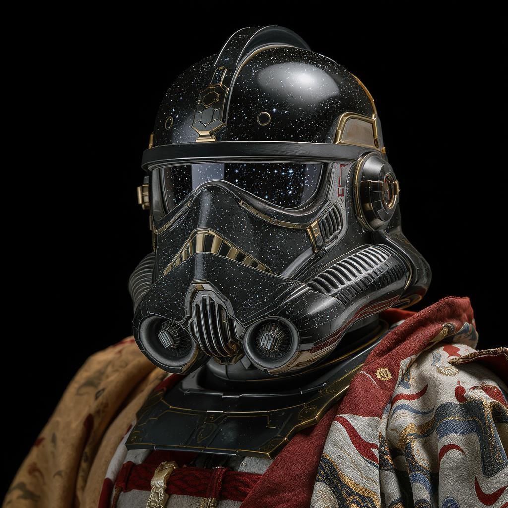 View this AI-generated image featuring close up of an individual donning a helmet reminiscent of a steampunk stormtrooper exhibiting incredibly detailed features in a star wars imperial motif the attire combines kimono inspired armor with intricate samurai armor elements rendered in an ukiyo e style