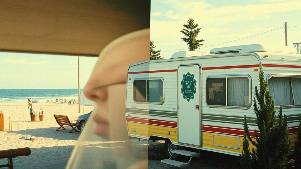 Close-up double exposure with a medical illustration vibe, set against a backdrop of a trailer park by the beach. Elements of overlap with industrial themes meet fine arts aesthetics, featuring uneven rows in a grid-like structure. The composition includes extreme screen print techniques with faded imagery, leaving ample white and negative space. Large pictures are cut off-center as if taped together, with aspects of split images creating circles of vintage appeal. Influenced by the works of Shepard Fairey, mimicking a carnival poster style through color overprinting in light blue, red, brown, yellow, and green, the scene incorporates pine trees and captures a sense of offbeat charm.