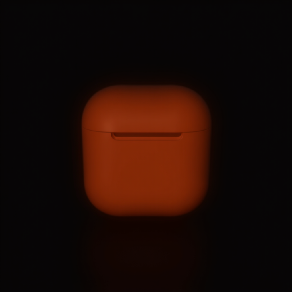 View this AI-generated image featuring close up front shot of an apple airpod pro in vibrant orange captured with a fujifilm gfx 100s camera using an aperture of f 8 and iso 100 set against a deep matte black background showcasing subtle reflections and shadows adding depth to the minimalist composi