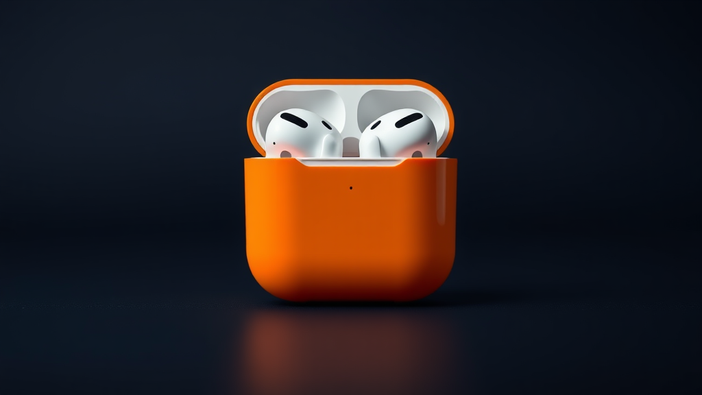 Close-up, front shot of a custom orange Apple AirPods Pro, captured with a Fujifilm GFX 100S, aperture at f/8, ISO 100, in a solid dark navy blue environment, showcasing sleek reflections and subtle shadows to enhance the vibrant color contrast.