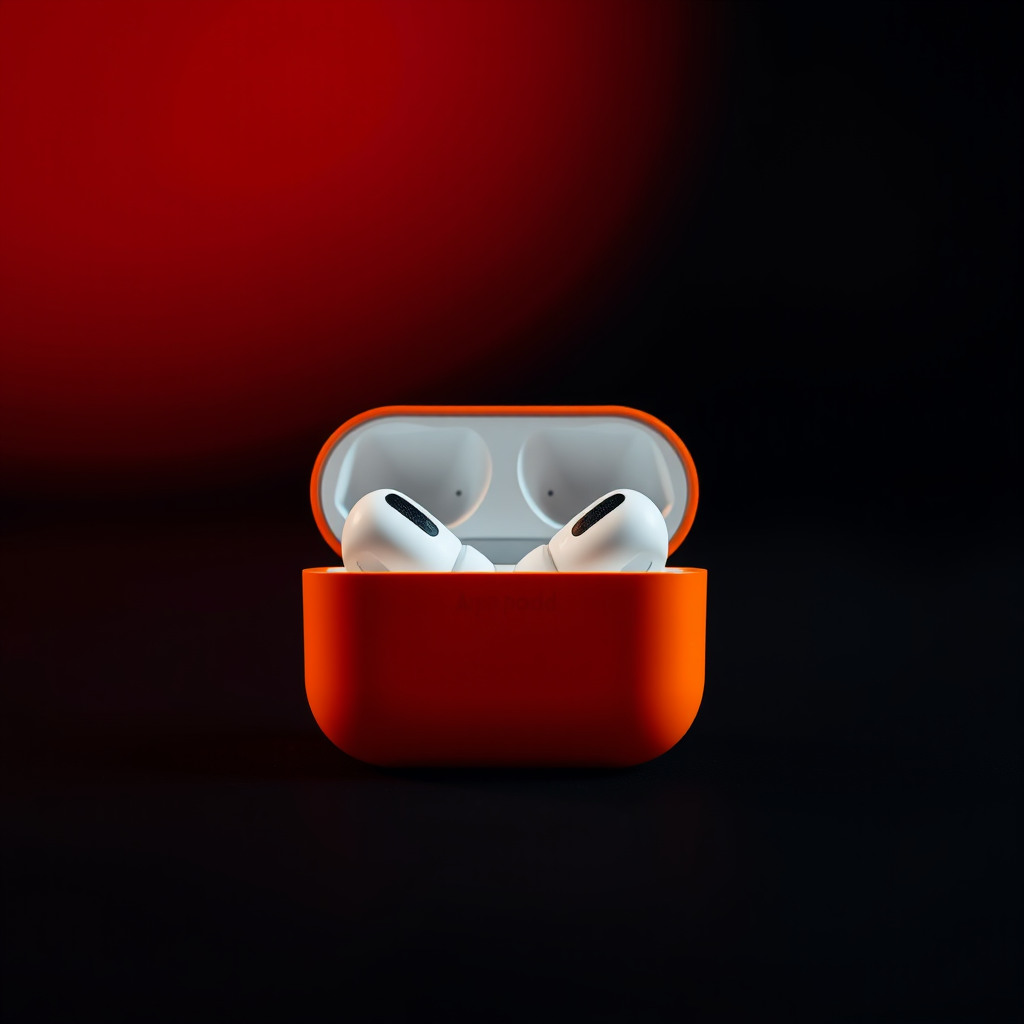 Close-up front shot of customized Apple AirPods Pro in a vibrant orange color, taken with a Fujifilm GFX 100S at an aperture of f/8 and ISO 100, placed in a solid black environment with a subtle spotlight highlighting the sleek finish and texture of the earbuds.