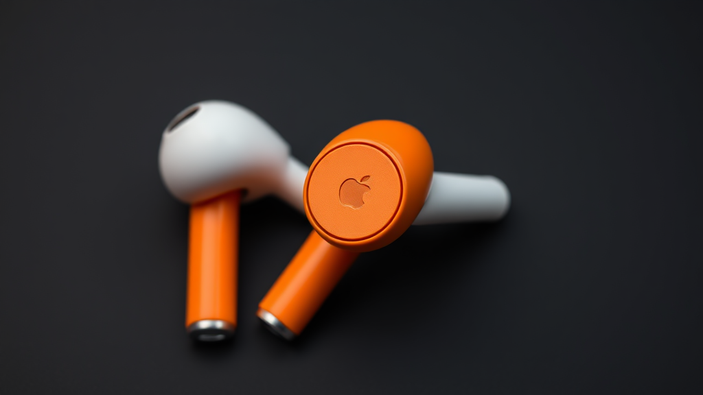 Close-up front shot of customized orange Apple AirPods Pro, taken with a Fujifilm GFX 100S, aperture set at f/8, ISO 100, against a deep charcoal gray background, soft lighting highlighting the texture and detail of the earbuds.