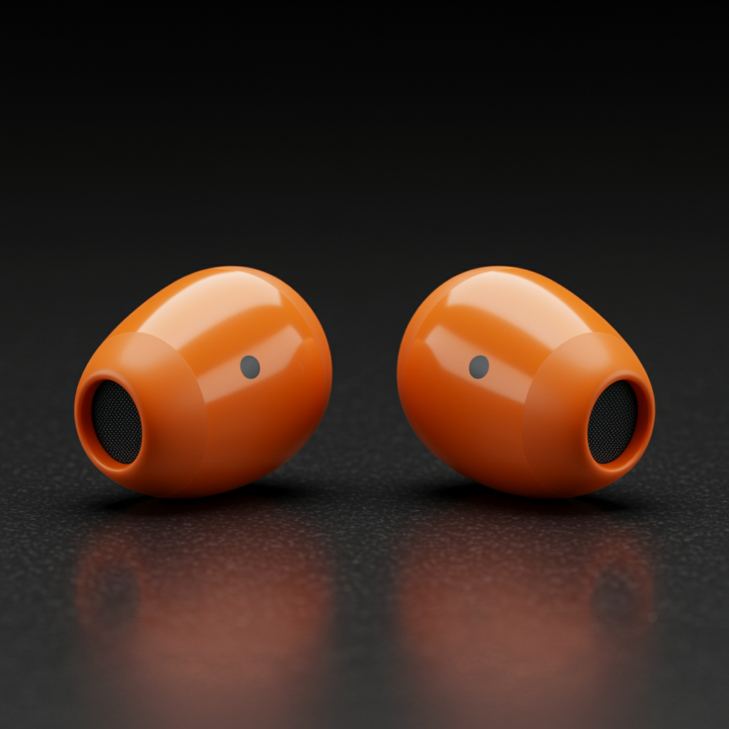 Close-up front shot of orange Apple AirPods Pro captured with a Fujifilm GFX 100S at aperture f/8 and ISO 100, set against a matte black background with subtle highlights to accentuate the sleek design and vibrant color, showcasing the intricate details and textures of the earbuds in high resolution.