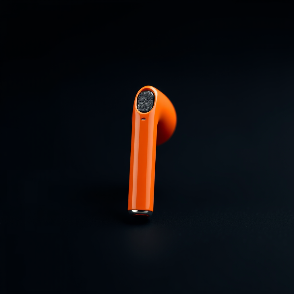 Close-up frontal view of a custom-painted vibrant orange Apple AirPod Pro, captured with a Fujifilm GFX 100S camera, set at an aperture of f/8 and ISO 100. The sleek wireless earbud is sharply defined against a deep matte black backdrop, its glossy surface reflecting subtle highlights.