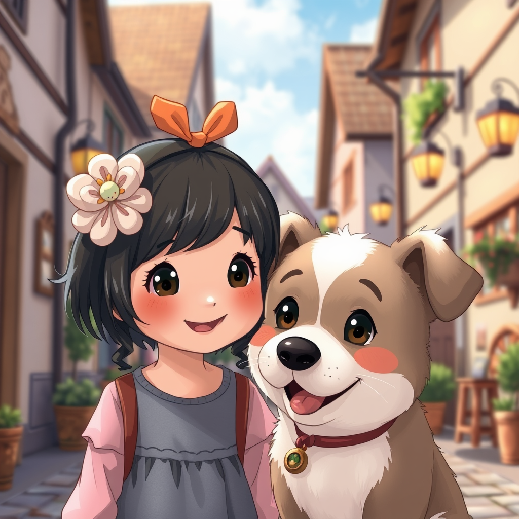 Close-up illustration of a cute little girl and her adorable dog in a village street, featuring a cartoonish vector style with every intricate detail focused on their expressive faces. The artwork draws inspiration from Hayao Miyazaki and Makoto Shinkai, using a mix of media and soft colors for an ultra-high resolution. The depiction captures warmth and charm, with elements of whimsy and fantasy. Notably, the piece avoids issues like low resolution, jpeg artifacts, or any distortions, ensuring clarity and sincerity in expression without unnecessary embellishments or distractions. The visuals are full of life and narrative depth, reminiscent of an enchanting storybook moment, emphasizing big, expressive eyes and a joyful, picturesque setting.