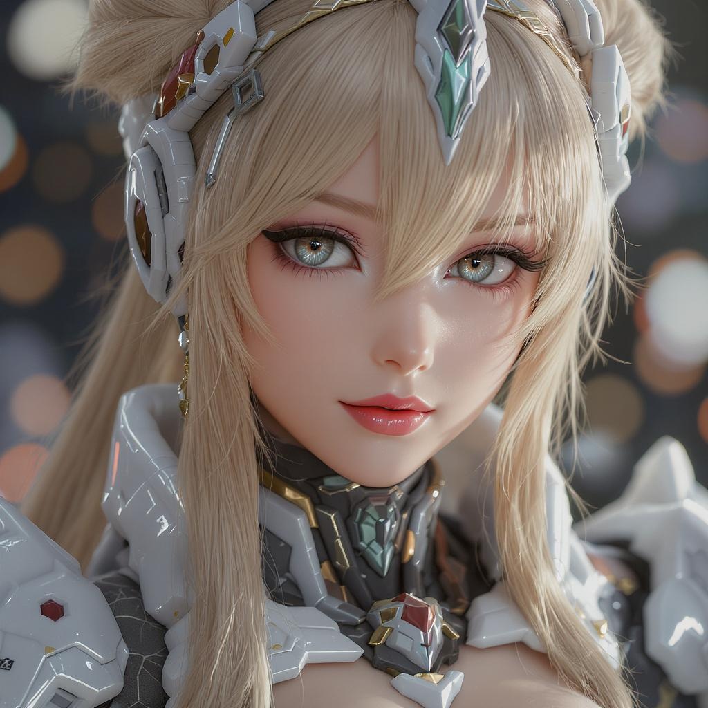 A striking close-up image of an enchanting mecha girl, featuring beige blonde hair with dark tips cascading elegantly, and an angelic face highlighted by seductive eyes and delicately pouty thin lips. Her white-silver armor gleams with intricate detailing, complemented by head accessories that enhance her ethereal aura. The scene is rendered with HDR and ultra high-definition detail, enveloped in a bokeh effect that adds a dreamy dimension. Light bloom and cinematic lighting illuminate her features, providing a stunning play of shadows and highlights. The depth of field creates a sharp focus on her mesmerizing expression, capturing the essence of concept art and the realism of Unreal Engine 5 with RTX technologies. The photorealistic quality immerses viewers in her world, while slight imperfections, like the absence of arms or hands, add an intriguing layer to her design.