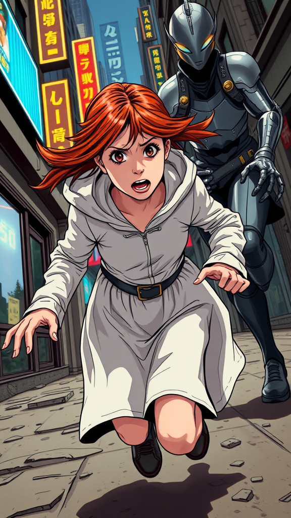 Close up image of a frightened girl with auburn hair wearing a long-sleeve white dress with a hood, desperately running for her life down a gritty city alley in a futuristic cityscape, vibrant with blue and yellow neon signs. She's being pursued by a formidable figure in sleek, metallic armor who is reaching out to grab her. The dynamic camera angle emphasizes the tension and speed of the intense chase scene, with thick outlines enhancing the dramatic comic book style. Her realistic skin and perfect hands express the urgency of her escape, while action lines and motion blur background accentuate the movement.