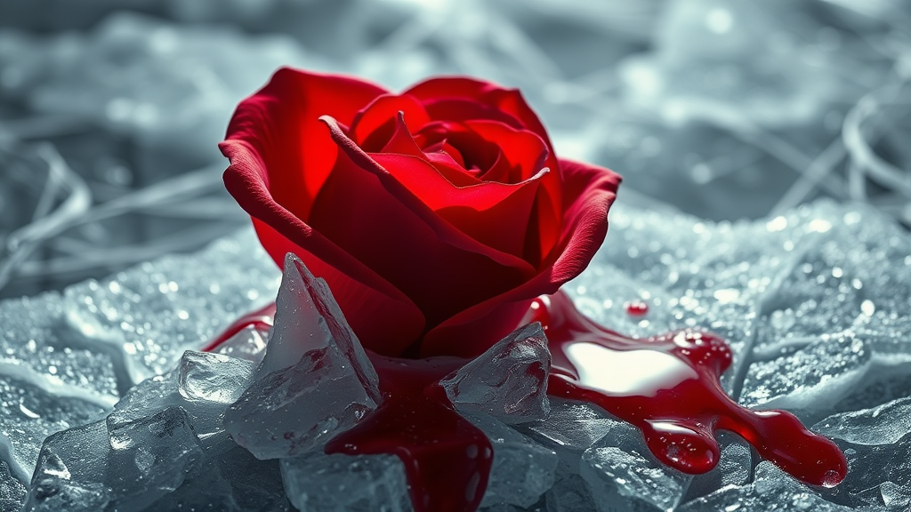 Close-up image of a radiant crimson rose emerging triumphantly through a block of ice, with a network of fractured and splintered ice patterns surrounding it. The surface displays a frosted palette, while the rose appears to bleed drops of blood that mingle with the melting ice. The scene exudes a Valentine's Day aura, captured in a cinematic style with a sharp focus on intricate details, accented by dramatic and moody lighting that amplifies the intense and romantic mood.