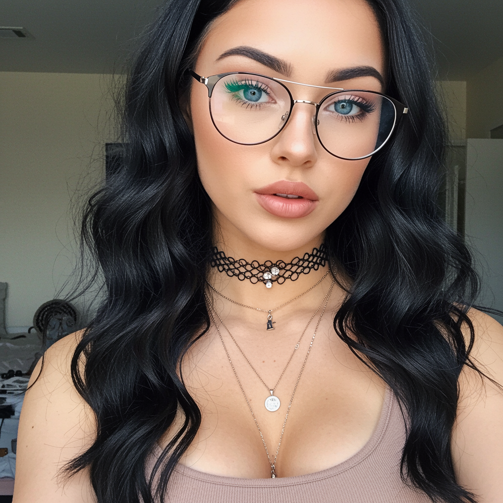 Close-up image of a striking young woman with stylish reading glasses, a delicate choker, layered necklaces, and a sleek tank top. She has an alluring curvy figure and cascading wavy black hair that frames her face. Her bright blue eyes and full, luscious lips add to her captivating appearance. The setting is indoors with a simple, unadorned background, highlighting her radiant and confident presence.