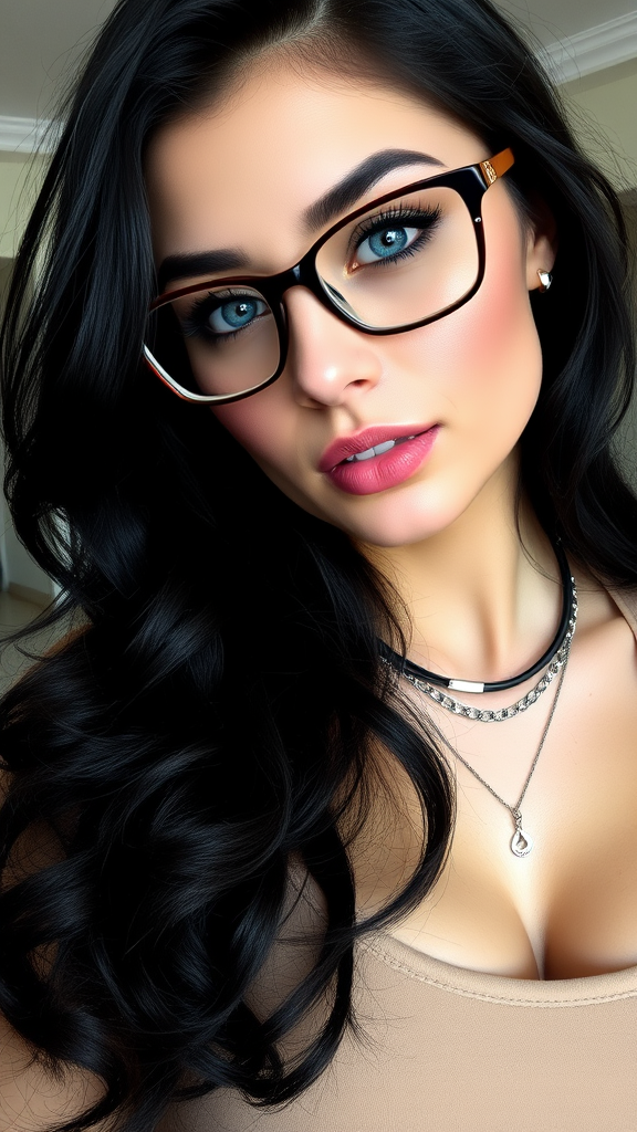 Close-up image of an attractive woman featuring stylish reading glasses, a layered choker necklace combination, and a fitted tank top. She has an hourglass figure and wavy jet-black hair that cascades over her shoulders. Her bright blue eyes are striking, and she possesses full, inviting lips. The setting is indoor with a minimalist background, allowing her features and accessories to stand out prominently.