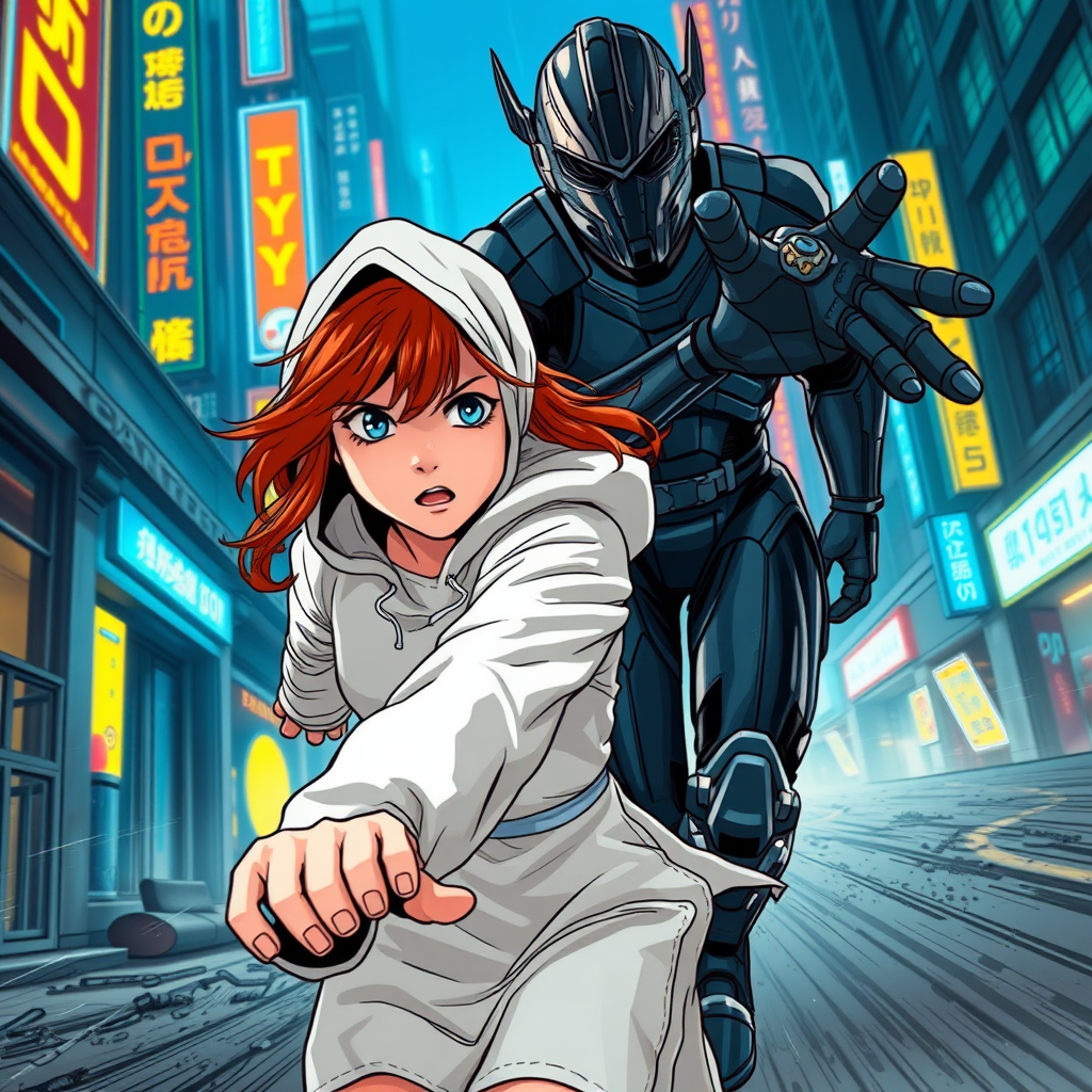Close up image of two characters, a girl with fiery auburn hair wearing a long-sleeve white dress with a hood, her expression frantic as she dashes desperately through a grimy city alley. Behind her, a formidable figure in sleek, high-tech armor is reaching out, his gloved hand just about to grasp her. The backdrop is a sprawling futuristic metropolis, alive with vibrant blue and yellow neon signs casting an ethereal glow. It's an electrifying chase, captured in a comic book style with thick outlines and a dynamic camera angle that emphasizes the intense drama. The girl's realistic features and perfect hands contrast sharply with the motion blur of the background, accentuated by powerful action lines that enhance the sense of speed and urgency.