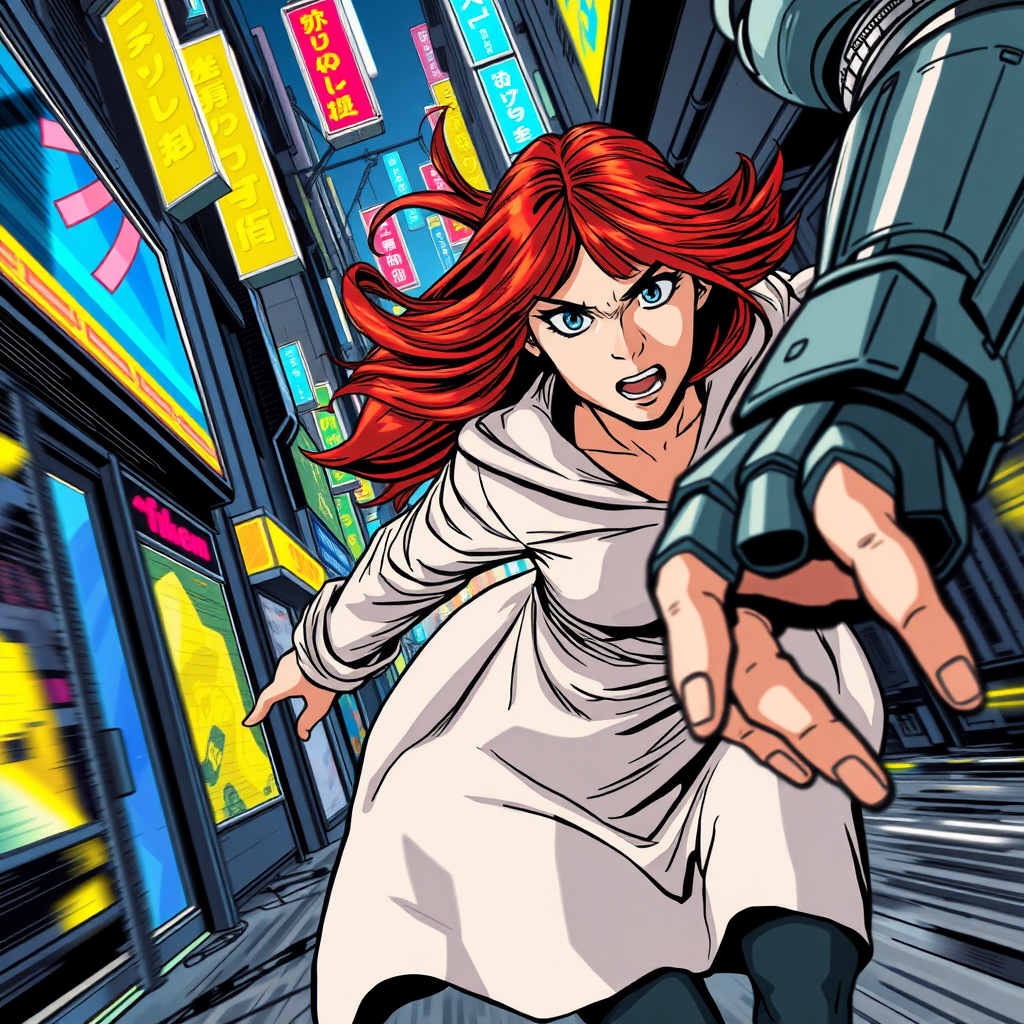Close up image of two characters in a dynamic chase scene; a girl with striking auburn hair, wearing a long-sleeved white dress with a hood, her expression filled with terror as she sprints desperately away, pursued by a man in futuristic armor. His armored hand reaches to grasp her in a narrow, grimy city alley. The vibrant cityscape around them bursts with blue and yellow neon signs casting colorful reflections. The scene captures a comic book style with thick outlines, employing a dramatic camera angle that emphasizes motion. Realistic skin tones and perfectly detailed hands convey emotion and tension, enhanced by action lines and a motion-blur background, encapsulating the energy and urgency of the moment.