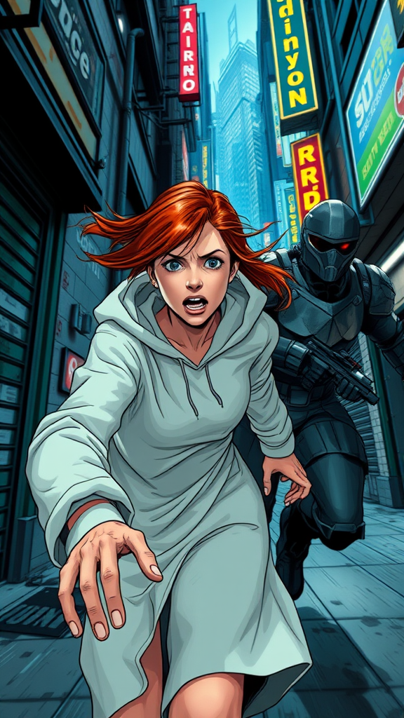 Close up image of two subjects, a girl with auburn hair in a long-sleeve white hooded dress, terrified, fleeing desperately, being pursued by an armored man and getting caught, racing through a grimy city alley in a futuristic metropolis illuminated by blue and yellow neon signs, an intense chase and action scene captured from a dynamic camera angle, featuring bold outlines and comic book style with realistic skin tones and meticulously detailed hands, emphasized by action lines and a motion-blurred backdrop.