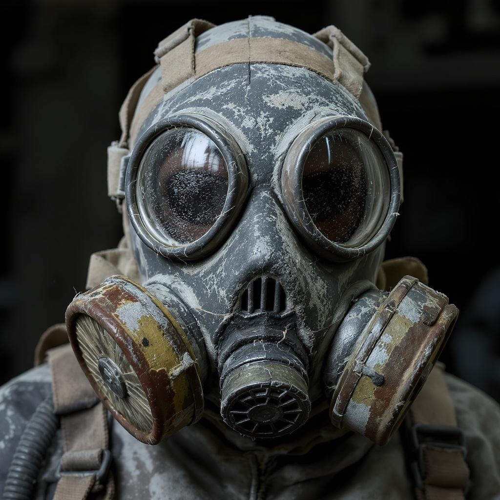 A detailed close-up of a Chernobyl liquidator's gas mask dominates the frame, showcasing the rugged, realistic texture of the protective gear. The mask's design is true to its Soviet-era origins, featuring fogged, rounded lenses that hint at the wearer’s obscured vision. Thick, aged rubber seals contour tightly against an unseen face, while robust straps crisscross the back, hinting at the weight of responsibility they bear. The entire surface is marked by a layer of ash and grime, whispering stories of radioactive fallout. The light catches on tiny cracks and imperfections, adding depth to the mask's timeworn character, evoking a haunting sense of history and resilience.