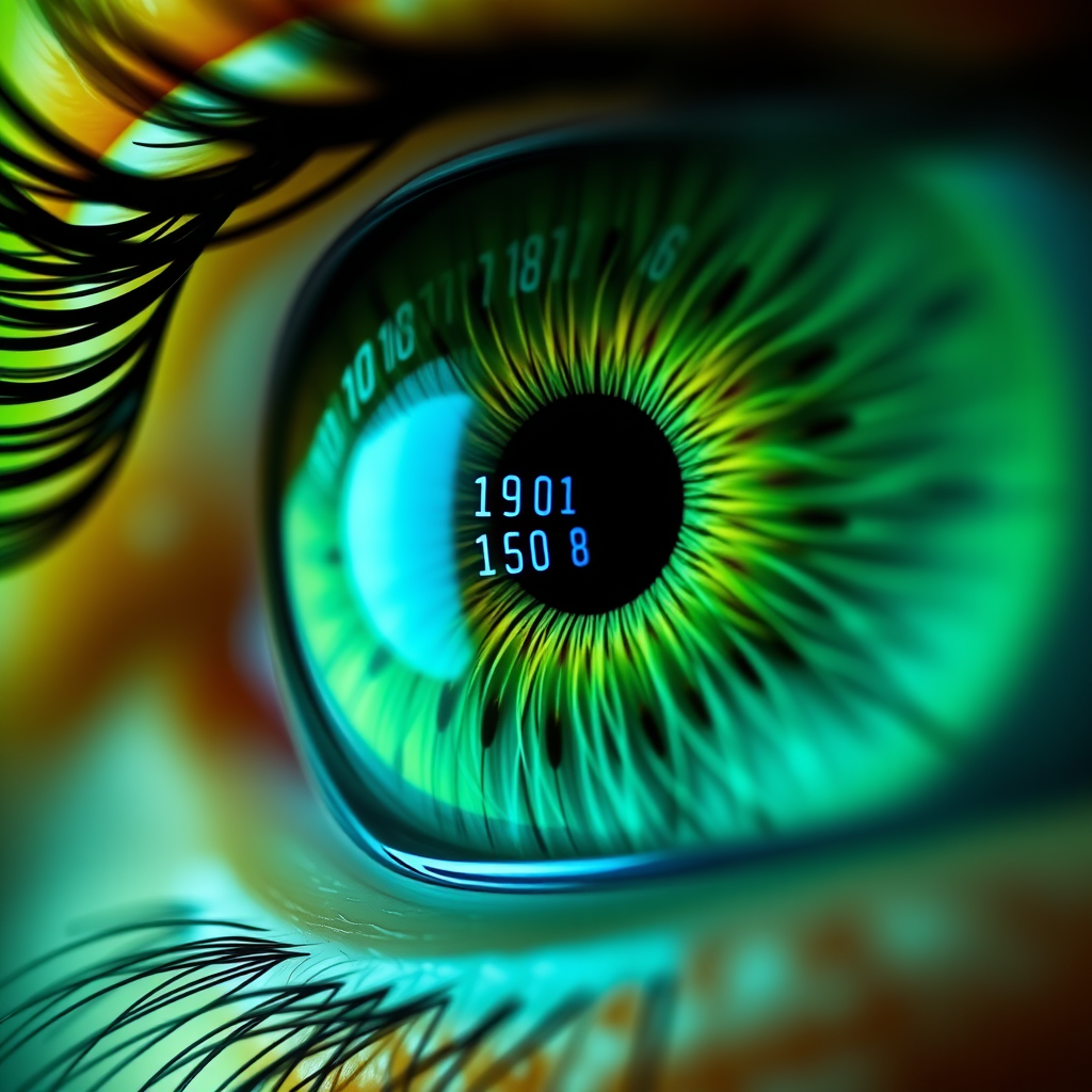 Close-up macro photography capturing the intricate details of a vibrant green eye, reminiscent of a cinematic film still, where the pupil reflects a glowing blue screen with subtle binary code patterns, creating a fusion of nature and digital technology.