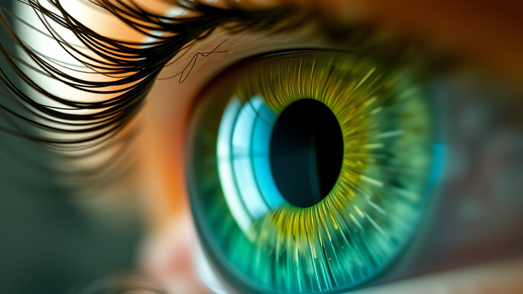 Close-up macro shot of an intricately detailed emerald green eye, reminiscent of a cinematic film still, with a soft reflection of a computer's pastel blue screen glimmering on the pupil, surrounded by delicate gold flecks in the iris, capturing the essence of technology meeting nature.