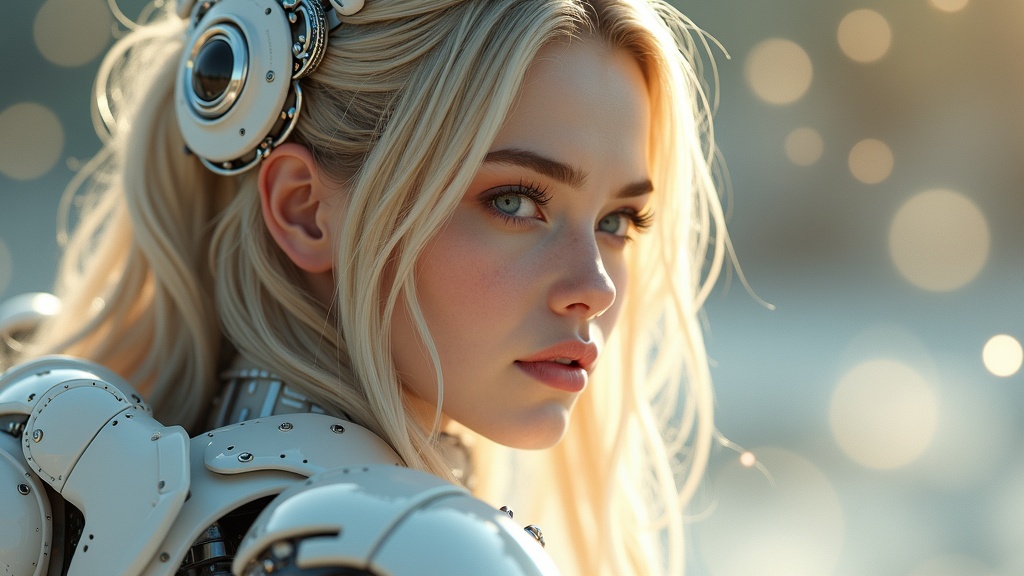 A stunning close-up of a captivating mecha girl, featuring dark-tipped beige blonde hair and an angelic face with seductive eyes and pouty lips. She is adorned in elegant white-silver armor and intricate head accessories. The scene showcases HDR with ultra-high detail, set against a beautifully blurred bokeh background. Cinematic lighting and light bloom create an ethereal ambiance, emphasizing the photorealistic qualities of the concept art. The use of Unreal Engine 5 and RTX technology enhances the depth of field and illumination. The artistic representation maintains a focus on the beauty and allure of this futuristic character, with subtle creative touches that keep her enigma alive.