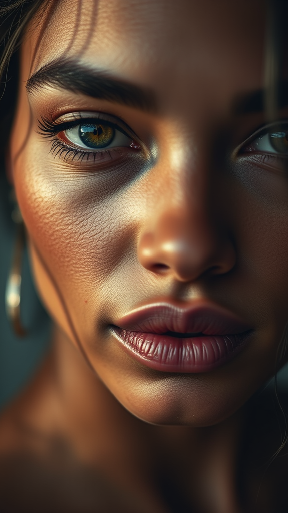 Close-up of a captivating fashion model, hyper-realistic detail, portrait captured on a Sony A7III, exceptional clarity, soft natural lighting, elegant expression, intricate textures, warm color palette, meticulously composed, --ar 40:70 --stylize 300