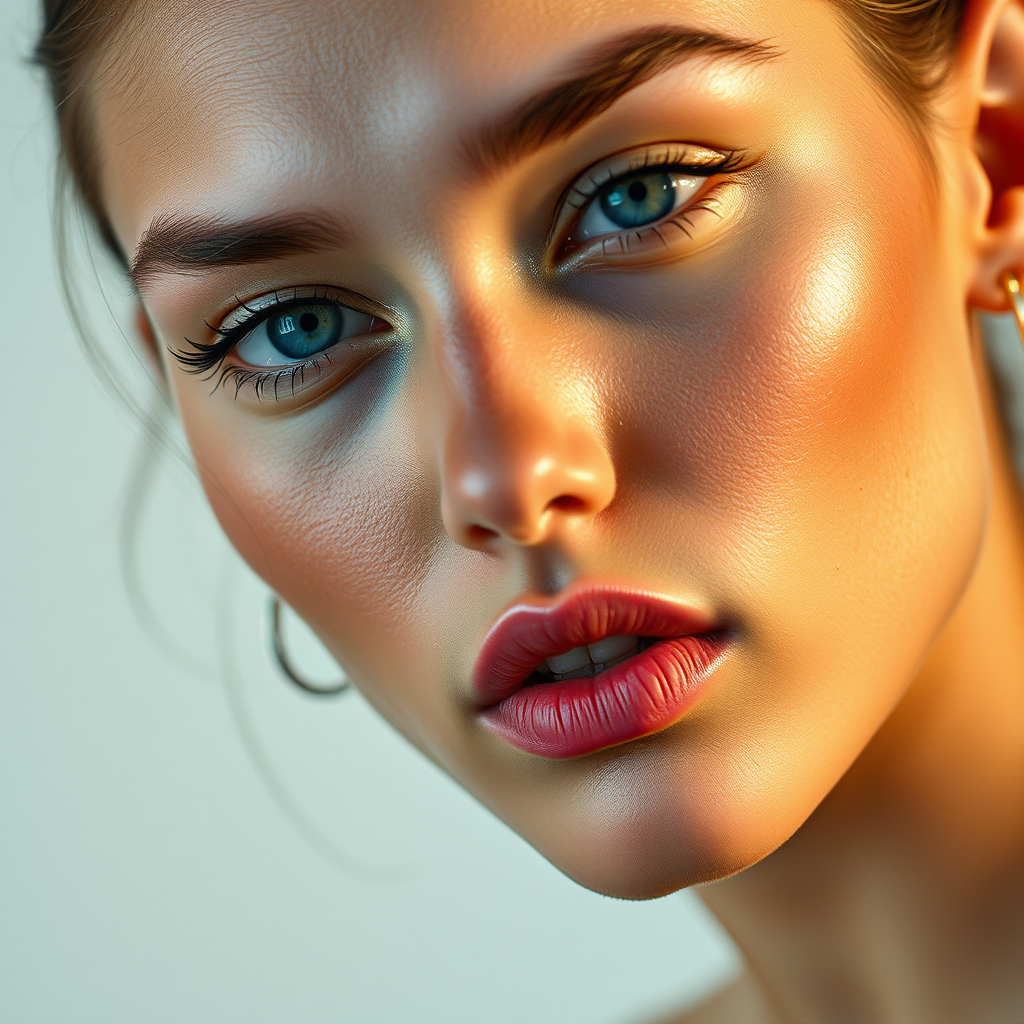 Close-up of a captivating fashion model, hyper-realistic, portrait, captured on a Sony A7III, exceptional detail and clarity in every feature, vibrant lighting enhances the model's striking expression, emphasizing intricate textures and tones, set against a minimalist background to focus on the subject --ar 35:64 --stylize 300.