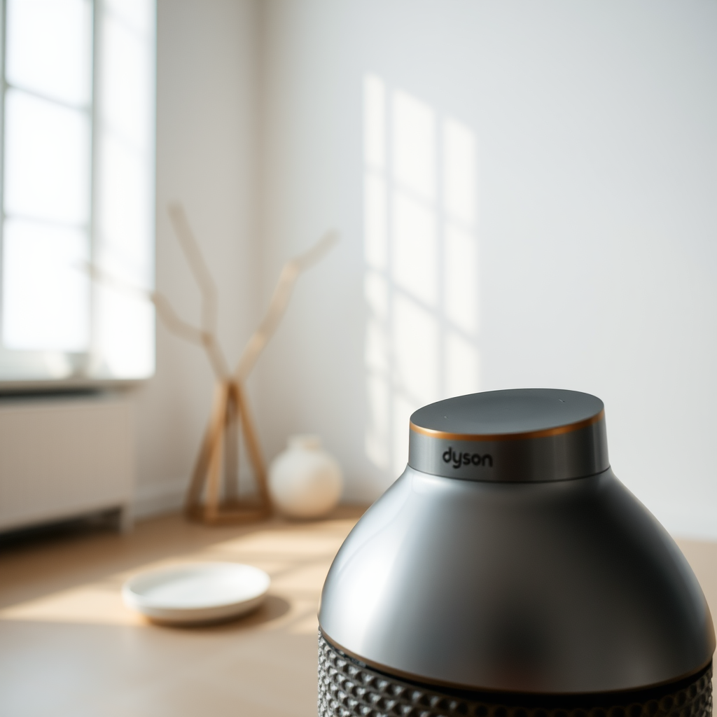 Close-up of a Dyson product in a studio setting, captured with a 100mm lens, featuring bright, midday lighting in a minimalistic environment with simple, elegant objects.