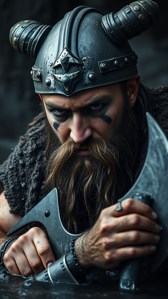 Close-up of a fierce Viking chieftain rising from slick, darkened mud, his piercing gaze cutting through the dim murk. A weathered metal helmet with majestic, curved ebony horns crowns his head, adorned with striking swaths of charcoal war paint. His tangled, raven-colored beard clings to his broad chest, flecks of mud dripping from each strand. A raw, angry scowl etches deep creases across his rugged face, highlighted by a jagged scar that bears the story of past battles. Clutched in his powerful grip is a mighty Viking axe, its blade shimmering menacingly in the cinematic lighting. Volumetric rays pierce the moody atmosphere, illuminating the droplets of water cascading down his form in an almost ethereal dance.