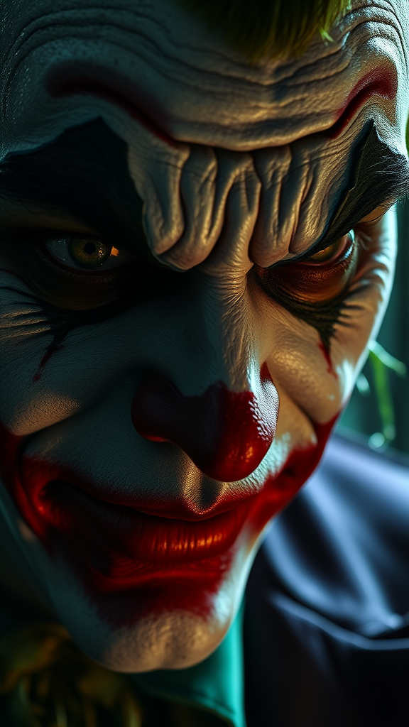 Close-up of a joker characterized by an intelligent, serious demeanor yet instilling an uncomfortable atmosphere, captured in the style of Christopher Nolan. The setting is dramatized through sharp, emotional lighting, offering profound emotional depth. Crafting a hyper-realistic digital painting with exceptional detail, this piece is inspired by the distinctive techniques of Milo Manara and Russ Mills. The artwork aims to be unforgettable with its ultra-high resolution and intricate textures. However, it introduces elements of surrealism with intentional defects like exaggerated anatomical features, alterations, and distorted forms, such as elongated necks and duplicated facial aspects, creating a morbidly fascinating yet unsettling visual. It carries an aura of mutation and deformation with blurred, dehydrated textures and unsettling proportions. Despite retaining a semblance of realism, features like badly drawn expressions and missing or extra limbs give an uncanny effect. The composition avoids recognizable signatures, watermarks, or logos, ensuring the focus remains on the evocative, yet distorted portrayal of the joker.