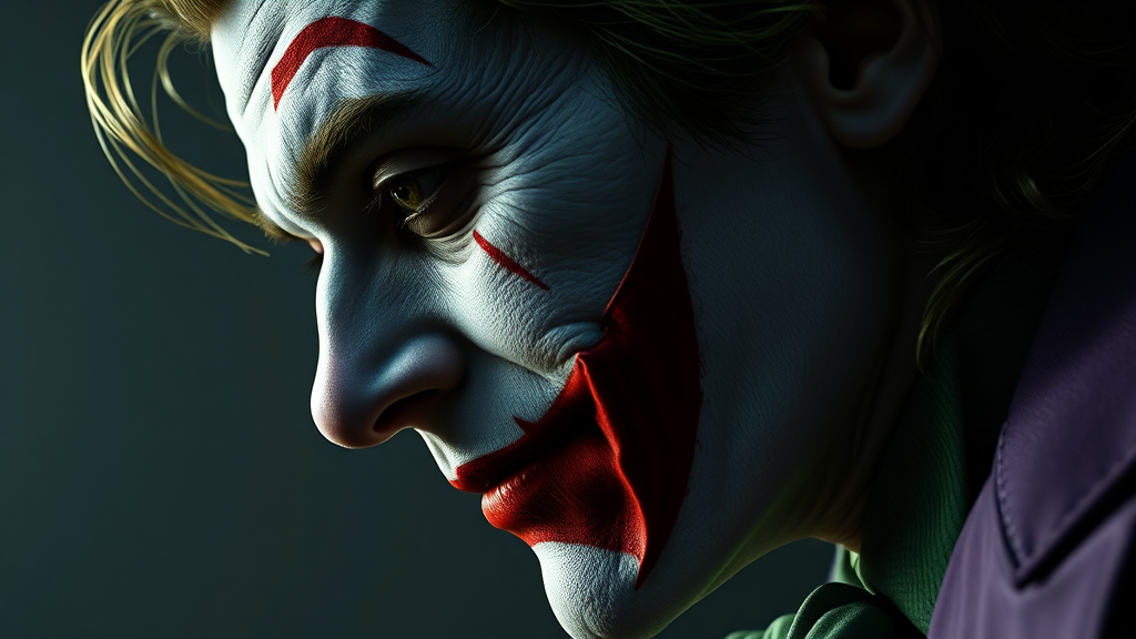 Close-up of a joker in side view, capturing the essence of Christopher Nolan's style; the character exudes intelligence and seriousness with a calm demeanor, set against an uncomfortable atmosphere. The scene has a horror undertone with dramatic lighting that emphasizes emotional depth. This hyper-realistic digital painting showcases intricate details in 8K resolution, reminiscent of the work of Milo Manara and Russ Mills, aiming for an unforgettable visual experience. The emphasis is on very intricate features, avoiding any elements described as worst quality, low quality imagery, artifacts, or any form of visual deformities like poorly drawn aspects, mutations, or disproportionate anatomy. The image maintains artistic clarity without including any extraneous elements such as watermarks, signatures, logos, or anything that distracts from the core visual focus.