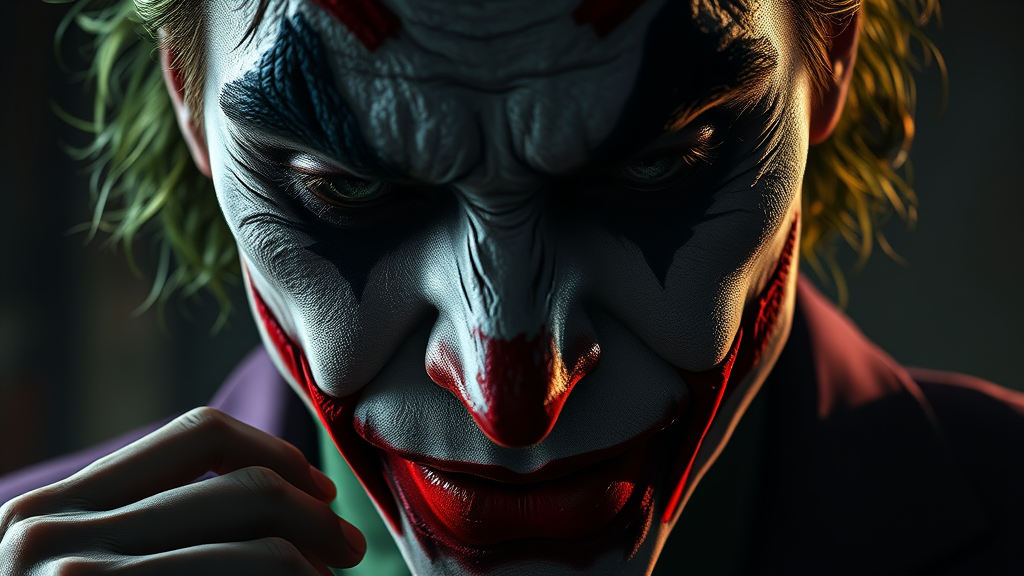 Close-up of a joker in the style of Christopher Nolan, exuding intelligence, seriousness, and calm amid an uncomfortable atmosphere. Dramatic lighting captures the emotional depth of this hyper-realistic digital painting, rich in maximum detail. Inspired by Milo Manara and Russ Mills, this unforgettable 8K piece is very intricate with a sense of complexity. Despite being detailed, it conveys elements of imperfection: poorly drawn hands and face, with mutations, deformations, and blurry aspects. The anatomy and proportions are intentionally flawed, featuring extra and missing limbs, disfigured features, and gross proportions. The elongated neck and disfigured facial features add to the unsettling vibe, with subtle indications of bad anatomy and deformities, captured with an uncanny realism.