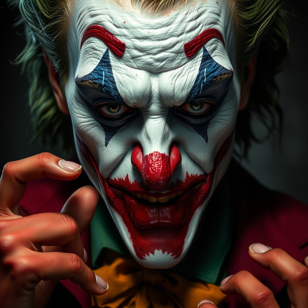 Close-up of a joker in the style of Christopher Nolan, capturing an intelligent and serious expression with a calm demeanor. The atmosphere feels uncomfortable, enhanced by dramatic lighting that provides emotional depth. This hyper-realistic digital painting, infused with the intricate detailing characteristic of Milo Manara and Russ Mills, aims to be unforgettable, presented in 8K resolution. Despite its artistic complexity, the image displays jpeg artifacts and deliberate imperfections. The joker's features might appear unsettling with poorly drawn hands and facial asymmetry, evoking mutations and deformations throughout. Blurry sections and distorted anatomy with extra or missing limbs are evident, contributing to gross and malformed proportions. The character's elongated neck adds to the surreal imagery. Absence of digital signatures, names, and logos ensures focus remains solely on the eerie depiction.