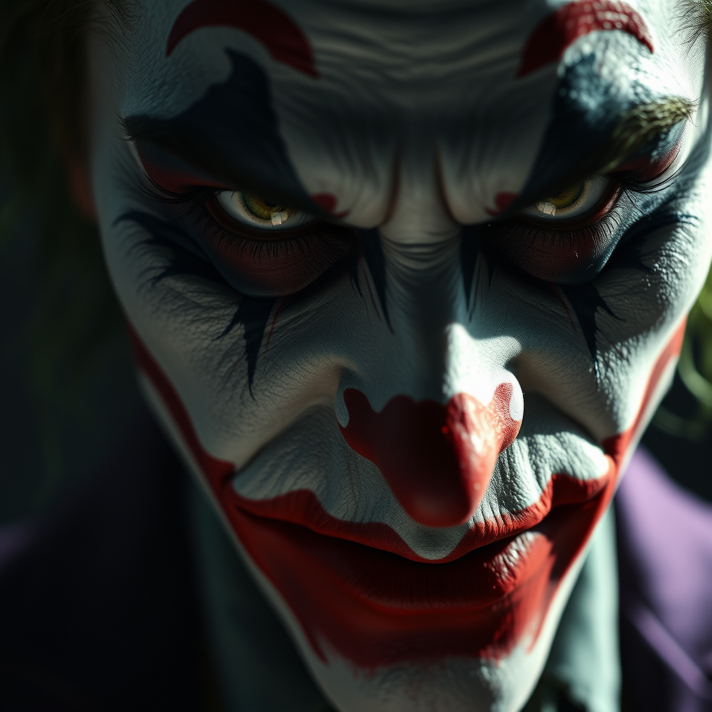 Close up of a joker, inspired by the style of Christopher Nolan—intelligent, serious, with a calm yet uncomfortable atmosphere. The scene is lit dramatically to emphasize emotional depth, resulting in a hyper-realistic digital painting. The work features maximum detail, drawing influence from Milo Manara and Russ Mills, aiming to be unforgettable, intricate, and rendered in 8K. Despite this, elements such as poorly drawn features, blurred effects, and distorted proportions are present, creating a morbid and unsettling mood. Anomalies like extra or malformed limbs and distorted facial characteristics add to the surreal, disfigured appearance. Additionally, it presents a long neck and off-kilter anatomy, with signs of jpeg artifacts, including text and watermark interruptions.