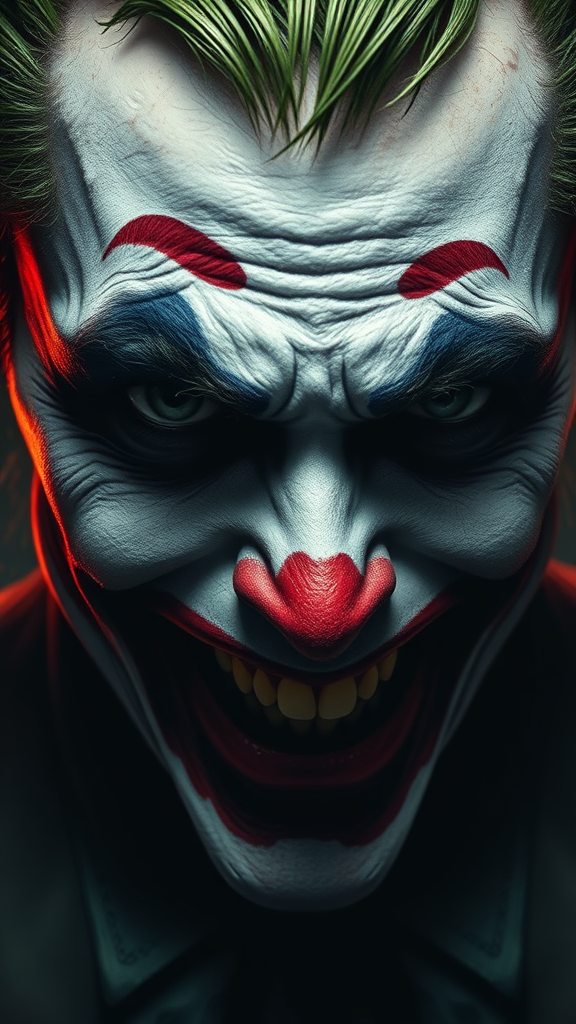 close up of a joker, style of christopher nolan, intelligent, serious, calm, tense atmosphere, dramatic light, emotional depth, hyper realistic, digital painting, maximum details, by Milo Manara and Russ Mills, unforgettable, 8K, highly intricate, text, low quality, jpeg artifacts, unattractive, repetitive, unsettling, distorted, blurry, bad anatomy, imbalanced proportions, extra limbs, duplicated face, warped features, unsettling proportions, malformed limbs, missing limbs, extra limbs, elongated neck, camera, name, signature, watermark, logo, autograph, trademark, cropped, censored, flawed anatomy, flawed body, flawed face, flawed teeth, anomalies.