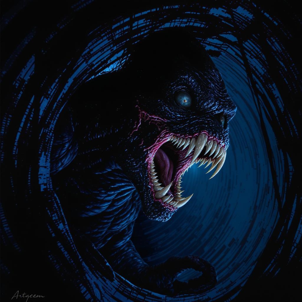 Close-up of a menacing creature with its mouth wide open, inspired by the style of Charles Fremont Conner, featuring a full-body portrait with intricate details. The scene is set against a stark, dark background with a bright blue backdrop, highlighting the creature's muscular form. The creature, poised to bite, emerges from the shadows of a dimly lit sewer. This image is designed as film key art, ideal for use as a profile picture with a resolution of 1024px. It captures the tension and intensity of a dramatic moment, with a touch of artistic flair from Artgeem, maintaining vivid details and a cinematic feel.