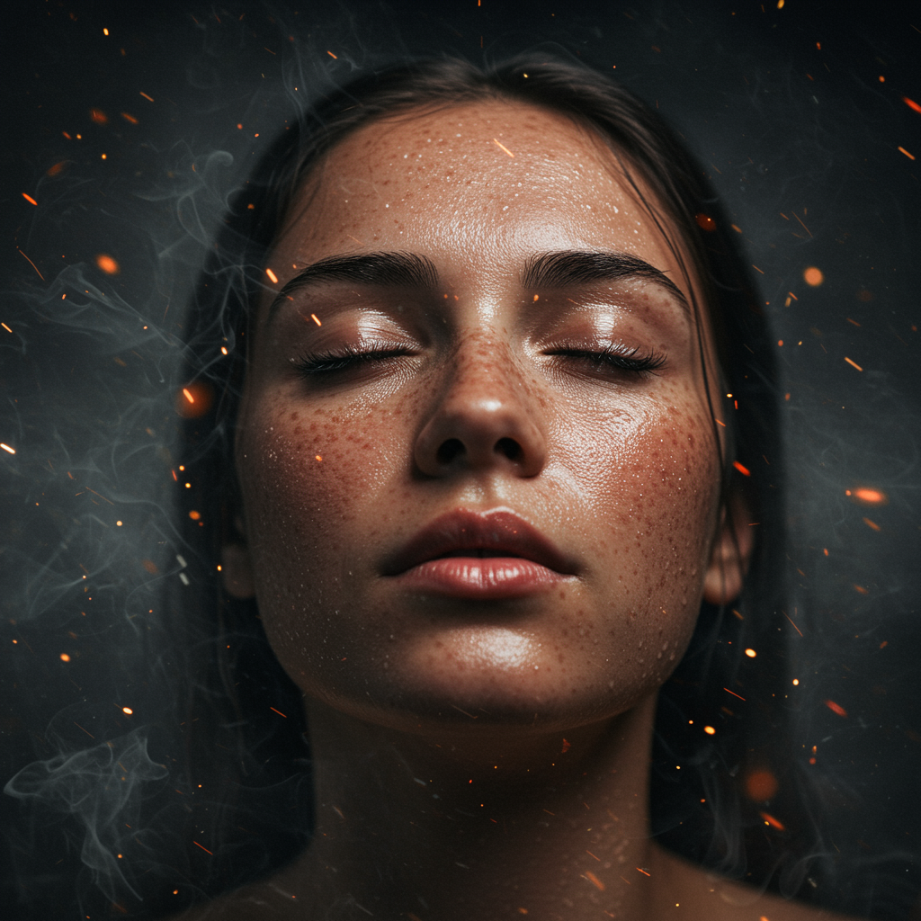 Close-up of a mesmerizing woman from below with closed eyes, exuding calmness amidst an intricate, dark atmosphere. Her skin boasts realistic texture and freckles, creating a natural and captivating look. Surrounding her are subtle hints of smoke and fog, interspersed with delicate flames and sparkles, all contributing to the scene's ethereal vibe. Her skin glistens as if soaked, enhancing her serene aura. The overall setting is moody and atmospheric, yet the details of her face and features, including slightly blurred elements and low-detail touches, imply a dreamlike quality. Despite minor imperfections in proportions and ambiguous outlines, the portrayal remains artistic and evocative, steering clear of grotesque or unsettling distortions.