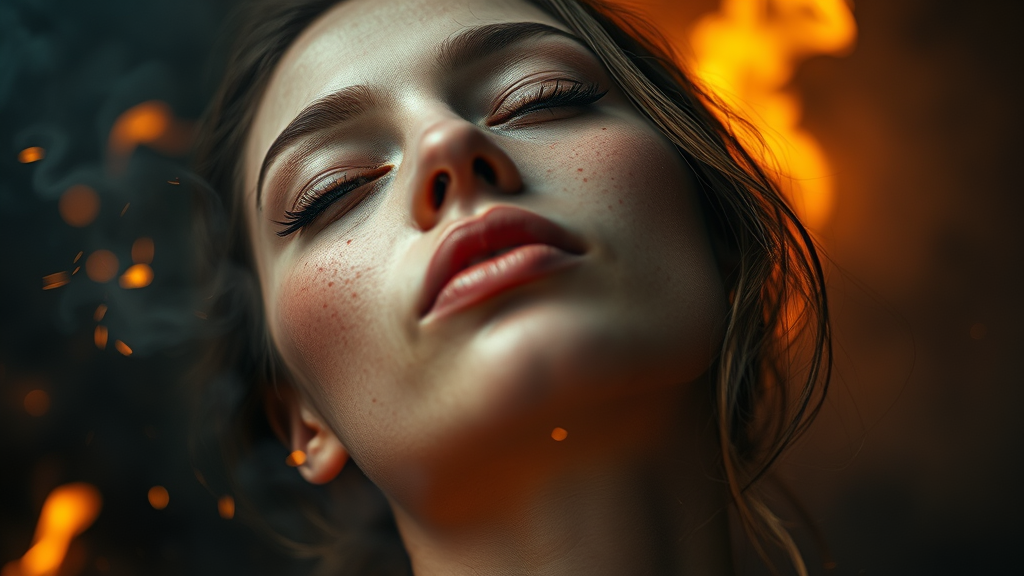Close-up of a serene woman from a low angle, eyes gently closed, exuding calmness amidst a fiery, detailed background. Her skin appears realistic, with visible freckles and a slight sheen as if soaked, enveloped in smoke and fog, creating a mysterious, dark ambiance. Soft, natural colors contrast against subtle sparks and flames, enhancing the scene's intensity. The image portrays a dreamlike quality with intentional blurriness, emphasizing artistic imperfections and surreal elements—such as deformed irises and pupils for a touch of intrigue. Despite a focus on beauty, subtle distortions in anatomy and proportions add an abstract layer, with extra fingers and elongated neck hinting at fantasy. These creative tweaks maintain the essence without introducing off-putting or overly graphic features.
