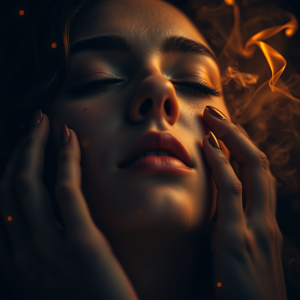 Close up of a serene woman from below, eyes peacefully closed, surrounded by an intricate, fiery atmosphere, 8k with realistic skin texture and freckles. Smoke and fog create a dark, mysterious ambiance, highlighted by subtle flames and sparkles. Her skin appears naturally colored and slightly damp, adding depth to the scene. Minor blurring emphasizes the ethereal quality, with hints of unique imperfections like deformed iris and pupils. Despite the presence of jpeg artifacts and blurred features, the image maintains an abstract beauty, offset by surreal elements like odd anatomy and unusual proportions. Melding arms and hands suggest mutation, while shadowy outlines hint at a morbid allure. Signatures and trademarks subtly weave into the composition, enhancing the overall enigmatic vibe.
