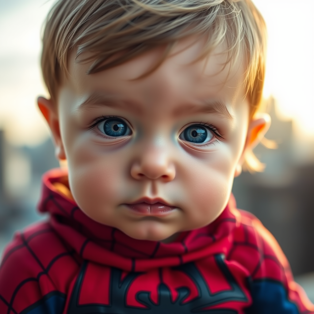 Close-up of a toddler Spiderman with a cherubic face and bright eyes peeking through a tiny Spiderman suit, the vivid colors of the suit contrasting against the soft textures of the young skin, subtle cityscape blurred in the background, soft light filtering through to create a warm glow around the miniature superhero, infusing the scene with a sense of wonder and adventure.