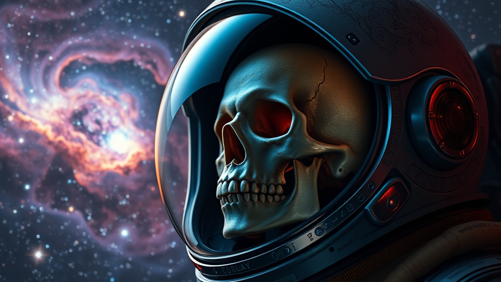 Close-up of an astronaut helmet with a skull inside, surrounded by the vastness of a star-studded galaxy; vibrant nebulae swirl in the backdrop, contrasting with the dark visor. The space suit features intricate designs, reflecting light from distant stars; hyper-realistic and rendered in vivid detail, capturing an unreal quality with high-definition clarity and exceptional detail suitable for 4k and 8k resolution.