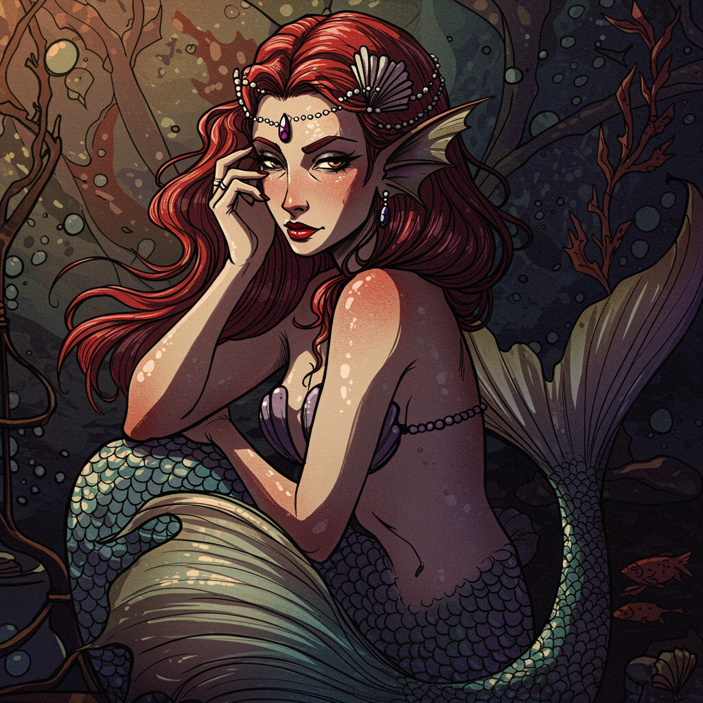 Close-up of an enchanting mermaid, exuding a sultry allure with an air of elegant narcissism, captured in rich inks and shadows. The scene is colorful and vivid, brimming with depth and drama, marked by expressive lines that blend realism with a hint of the fantastical. Rendered with meticulous attention to detail, the composition is complex and intricately designed, creating a moody atmosphere. Despite the careful craftsmanship, there are slight artistic imperfections like blurred or grainy elements, evocative of a dreamlike, almost surreal quality, where proportions are whimsically exaggerated. The enchanting figure remains uncensored and free of distractions such as text or logos, preserving her otherworldly beauty amidst subtle visual noise like jpeg artifacts, adding to the overall mystique.