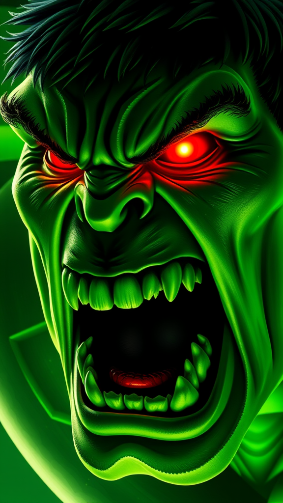 Close-up of Hulk's enraged face, mouth wide open in a fierce scream, piercing red eyes filled with fury, designed as an awe-inspiring masterpiece in gigantic scale, set against a luminous green backdrop resembling phosphorescence, rendered in ASCII-art style, emphasizing clarity and detail without any mockup, signature, watermark, or username distractions, ensuring high resolution, exceptional quality, sharp focus, well-framed image with vivid expressiveness, maintaining a 9:16 aspect ratio for dynamic composition, utilizing high creativity and detail intensity, version 4.