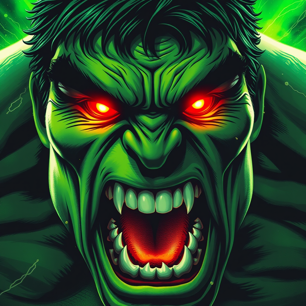 Close-up of Hulk's face in a furious scream, eyes glowing fiery red, epic scale, green phosphorescent background, detailed ascii-art, highly intricate, vivid intensity, richly textured, dynamic composition, immense power, --aspect ratio 9:16 --creativity level 10 --stylization 100 --version 4.