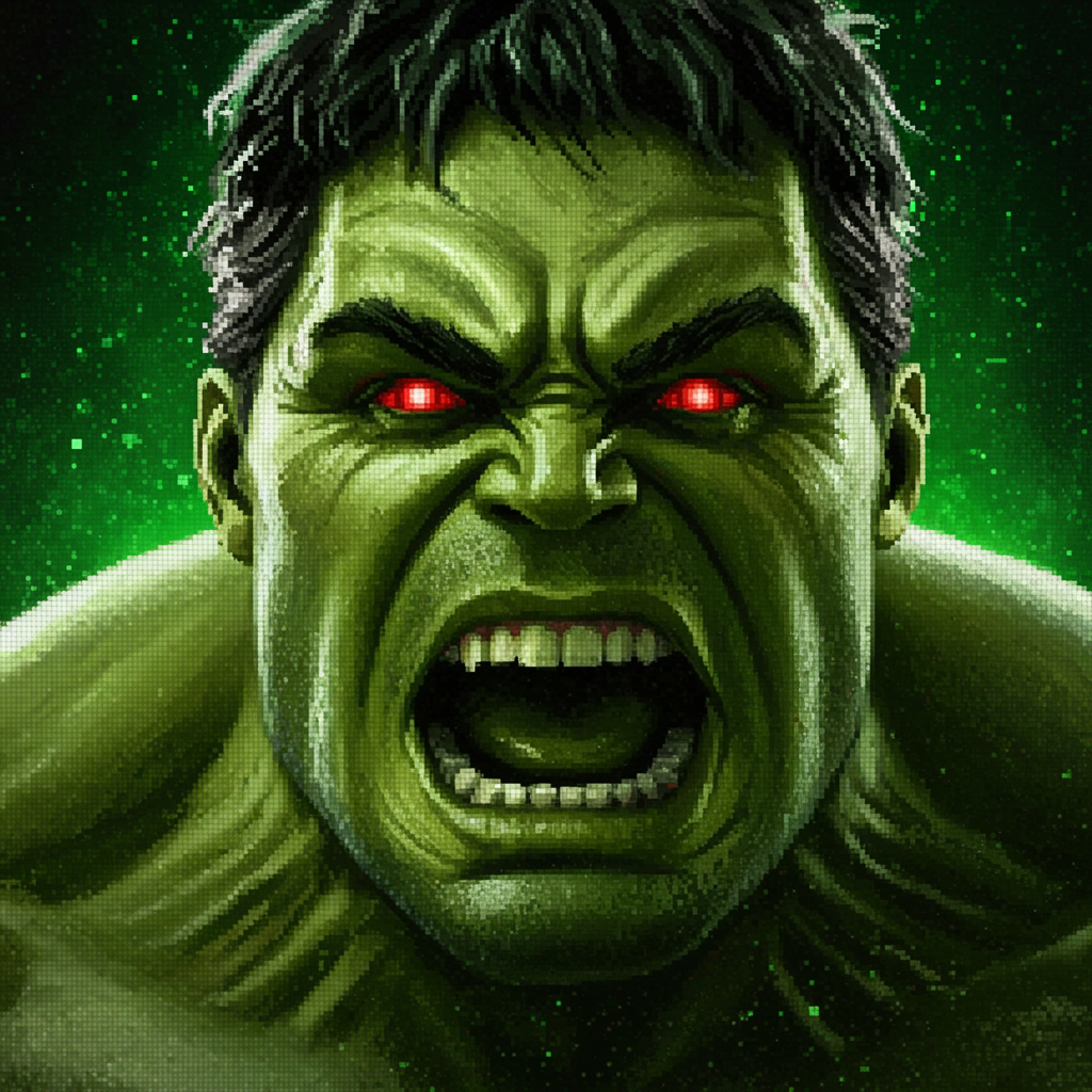 Close-up of Hulk's face in a furious scream, eyes glowing red with intensity, rendered as a stunning masterpiece on a massive scale, displayed on a vibrant green phosphorus screen, using detailed ASCII-art. Excludes unwanted elements like mockups, signatures, watermarks, usernames, as well as any low resolution, poor quality, jpeg artifacts, blurriness, or improper framing, preserving a clear and powerful visual impact.
