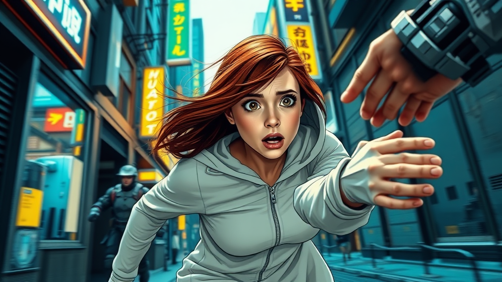 Close-up of two subjects: a girl with auburn hair in a long-sleeve white dress with a hood, looking frightened as she runs for her life, pursued by a man in futuristic armor. Her wide eyes reflect fear as his hand reaches out to grab her in a grimy city alley. Neon blue and yellow signs illuminate the scene in a futuristic cityscape. The chase unfolds with dynamic tension, captured in a comic book style with thick outlines. The camera angle is dramatic, focusing on her realistic skin and flawless hands, while action lines and motion blur emphasize the speed and urgency of the moment.